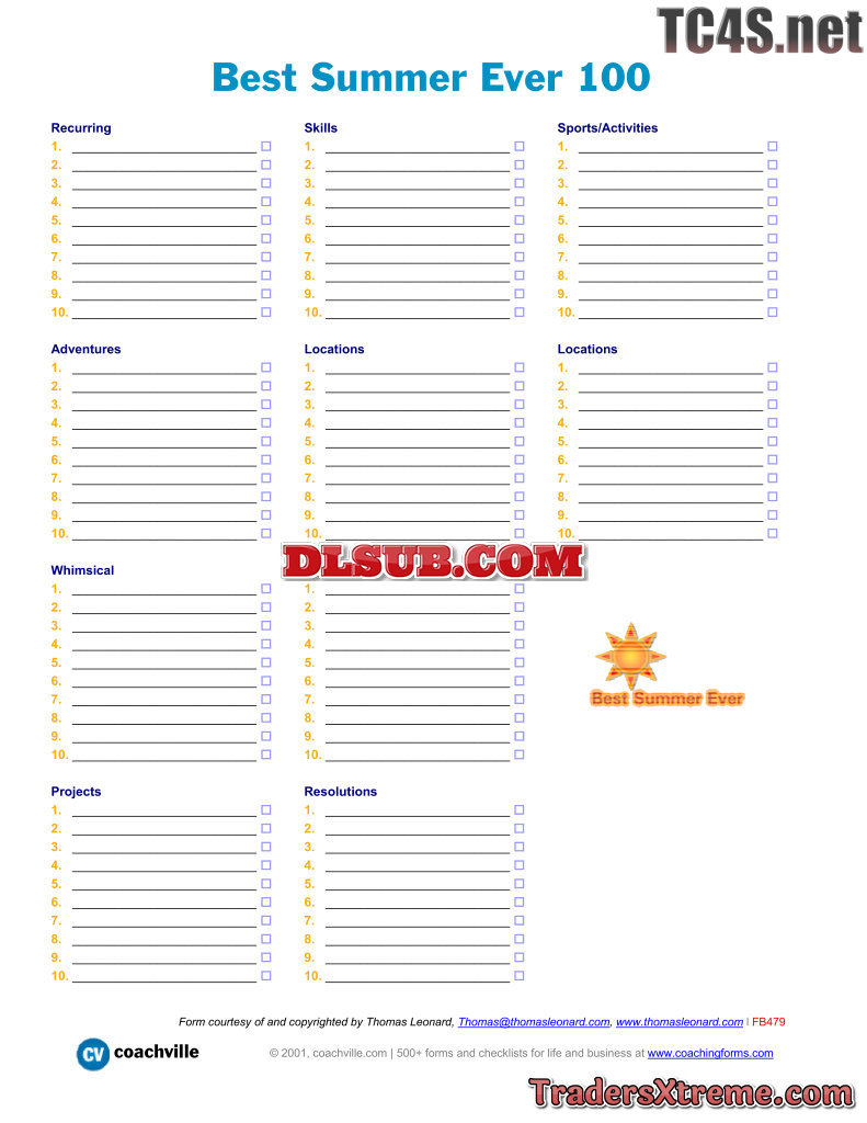 Worksheet To List 100 Things That Make Up A Great Summer - JPG Image File