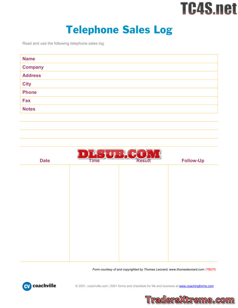Telephone Sales Log Template - JPG Image File
